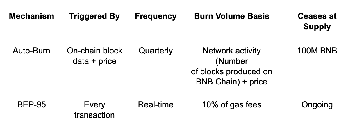 BNB’s token design includes a dual-burn mechanism consisting of a programmatic Auto-Burn (based on on-chain activity and price) and a real-time BEP-95 burn (burning a portion of gas fees). Together, these mechanisms aim to provide a continuous, network-driven reduction of BNB’s supply, helping align supply with network usage. Every transaction on BNB Chain contributes to network sustainability by adjusting supply in proportion to real economic activity, aimed to maintain equilibrium between usage, capacity, and token demand.