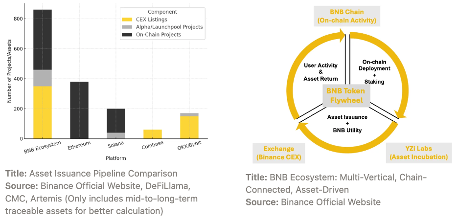 The BNB ecosystem, through its supportive venture partners such as YZi Labs, offers a robust, efficient, and comprehensive platform for asset issuance. These venture partners are strategically situated to onboard investment projects starting from the initial proof of concept, guide these projects through fundraising and initial distribution, and subsequently facilitate these projects’ global trading and decentralized ecosystem growth via the BNB Chain. By ensuring the establishment of top-performing token pairs (via CEX), BNB is becoming powerful and perhaps one of the most effective full-cycle asset-issuance hubs in the Web3 space.